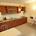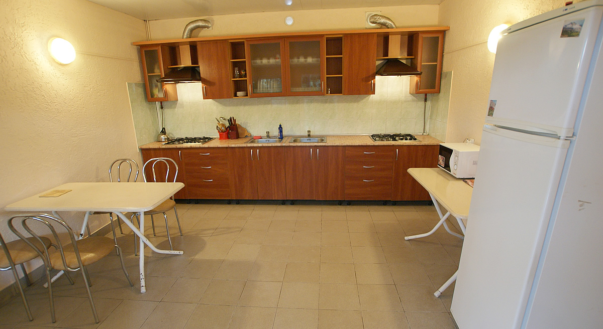 Для постояльцев номеров без кухни имеется общая большая и комфортная кухня, оборудованая кухонной мебелью и посудой. Холодильники, микроволновая печь, обеденные столы.