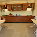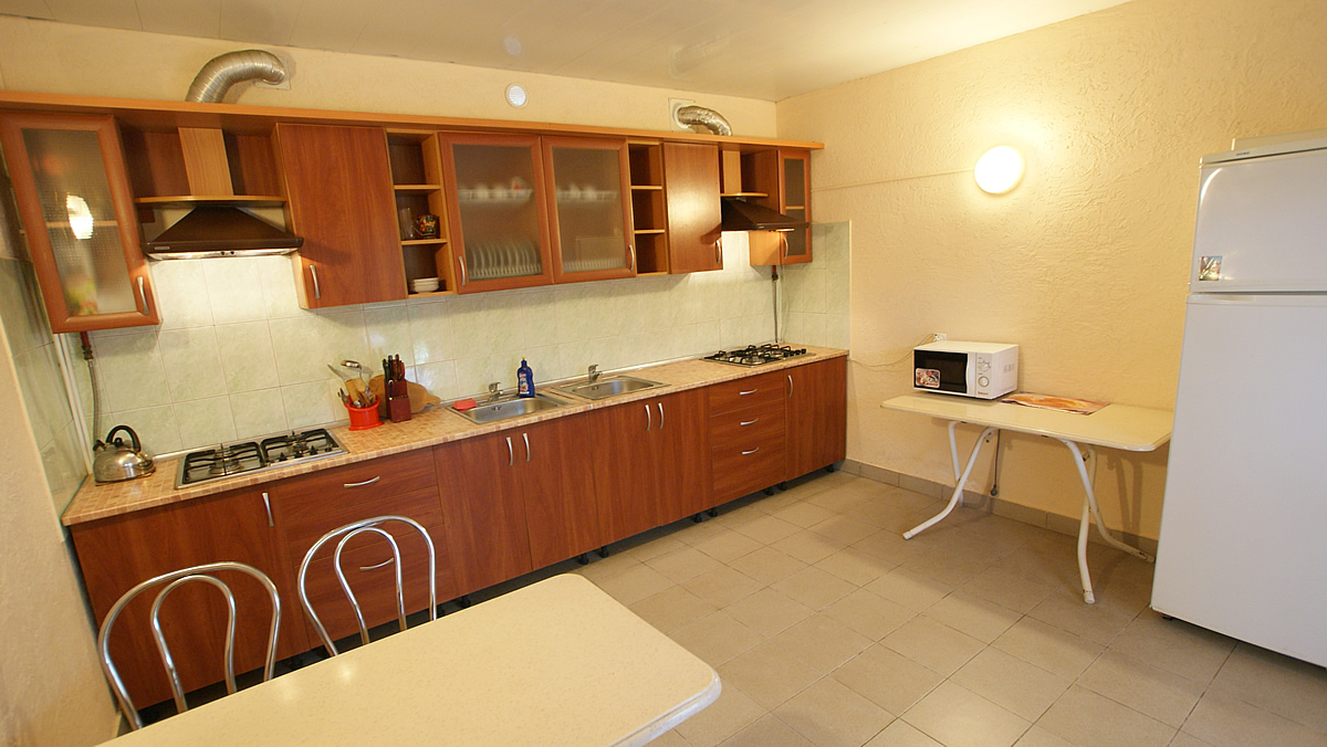 Для постояльцев номеров без кухни имеется общая большая и комфортная кухня, оборудованая кухонной мебелью и посудой. Холодильники, микроволновая печь, обеденные столы.